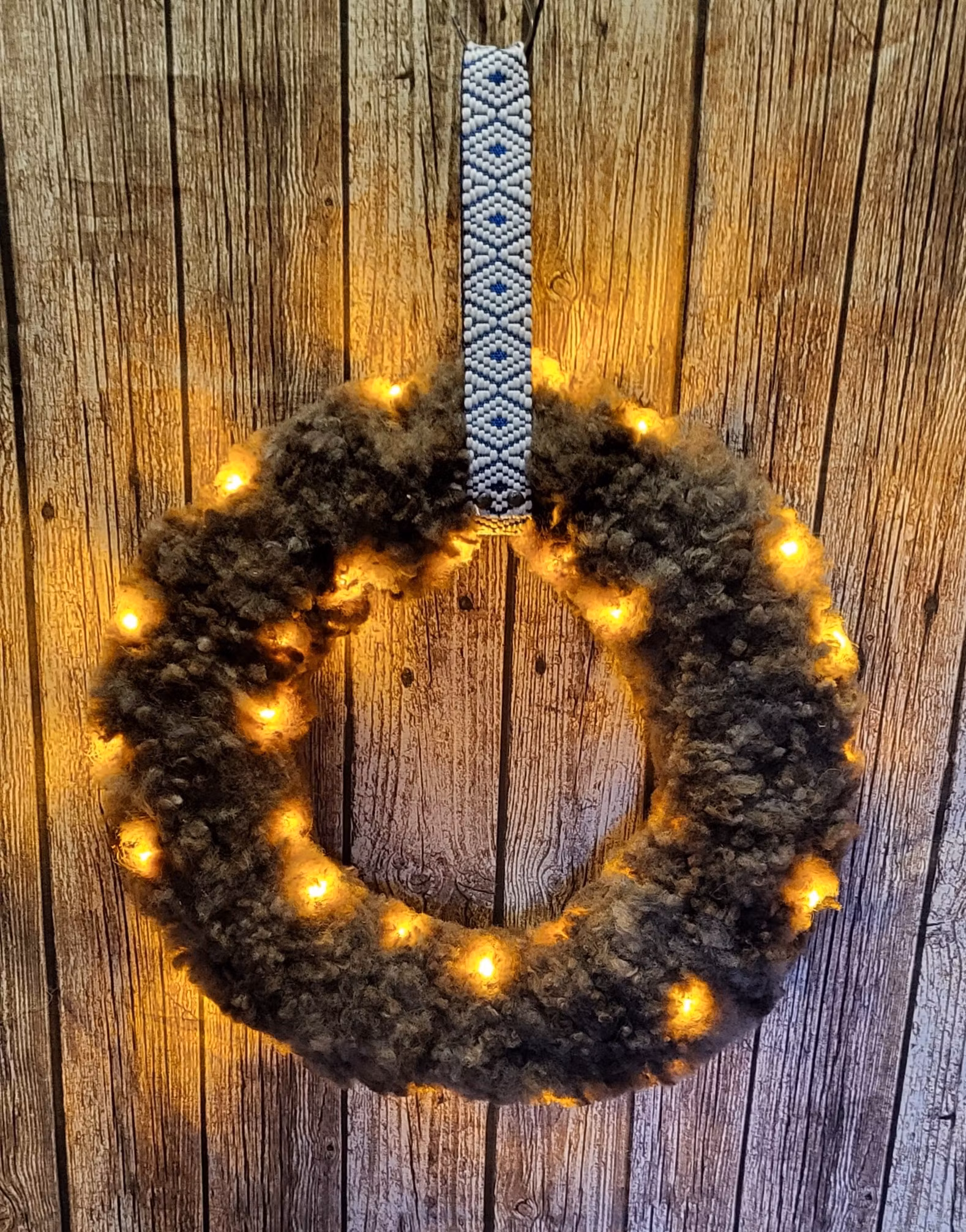 Stommen till kransen är 45 cm men med ullen bygger den ca. 10 cm till.
