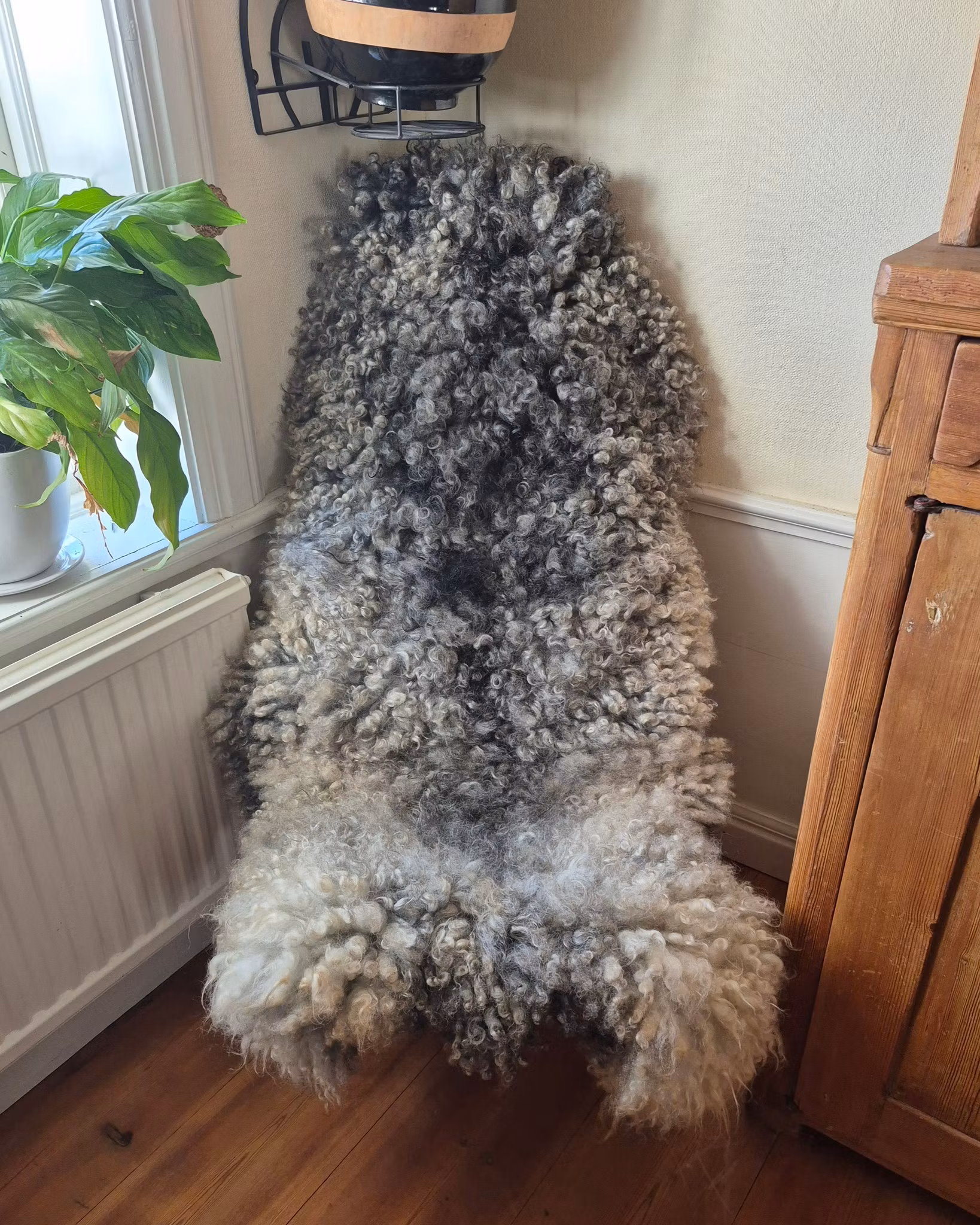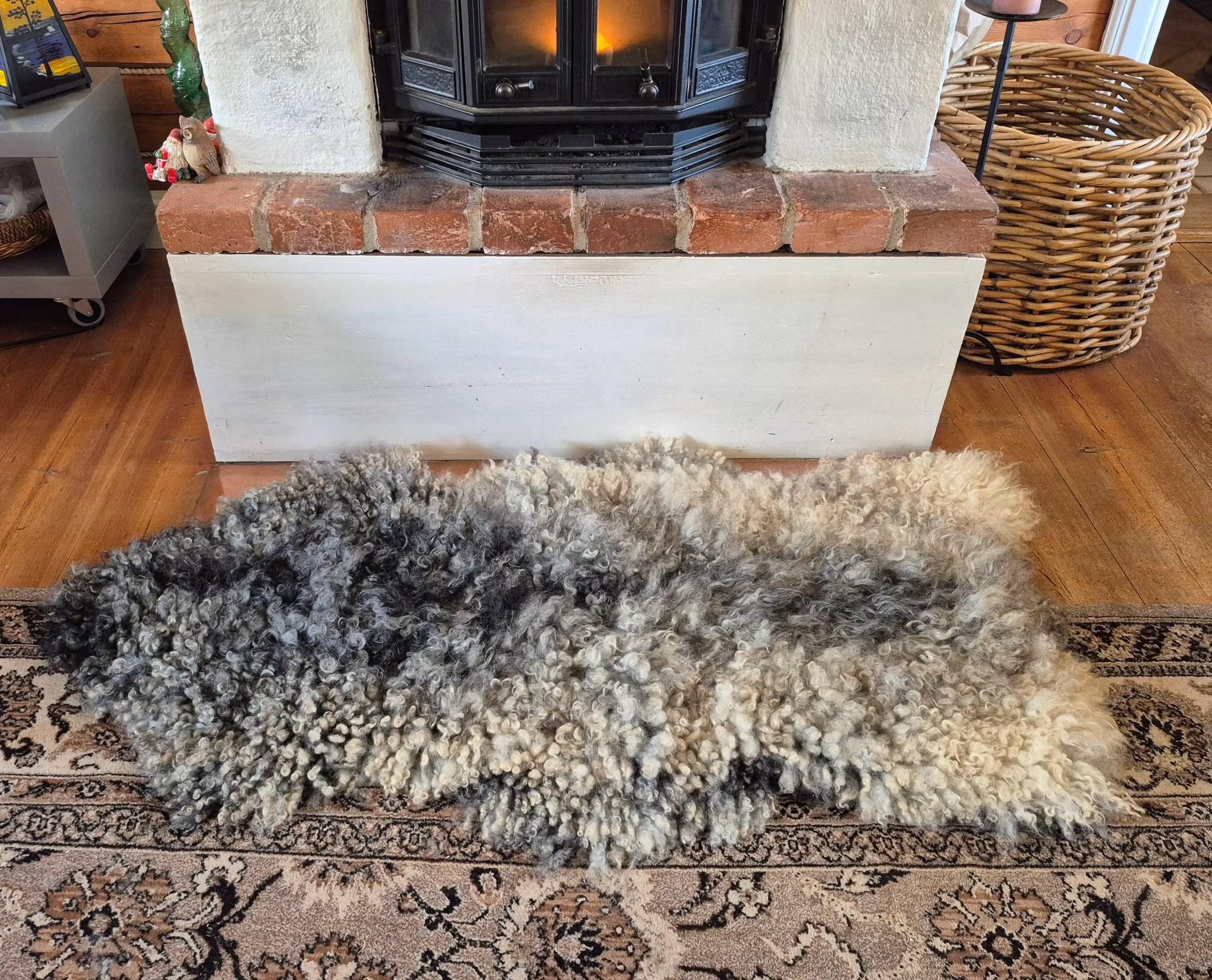 Ljusspräcklig fårfäll med grå och svarta lockar – ekologiskt fettgarvad i Järvsö.