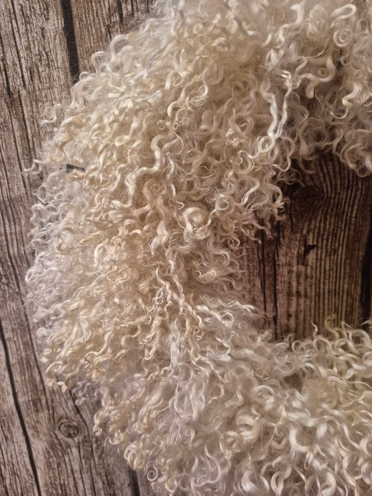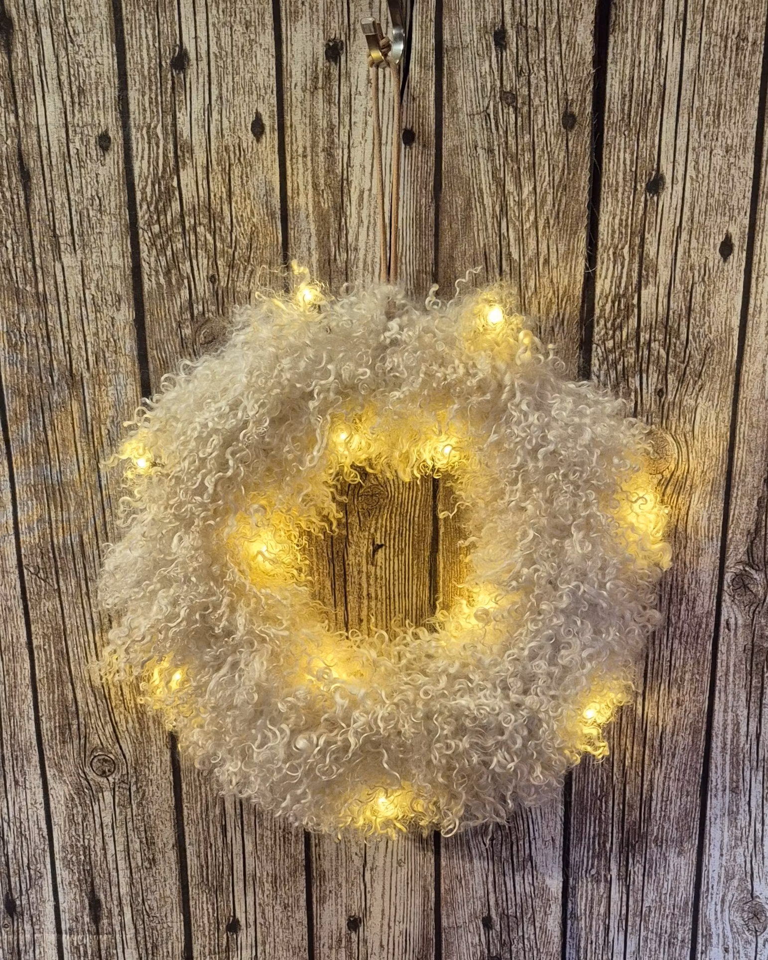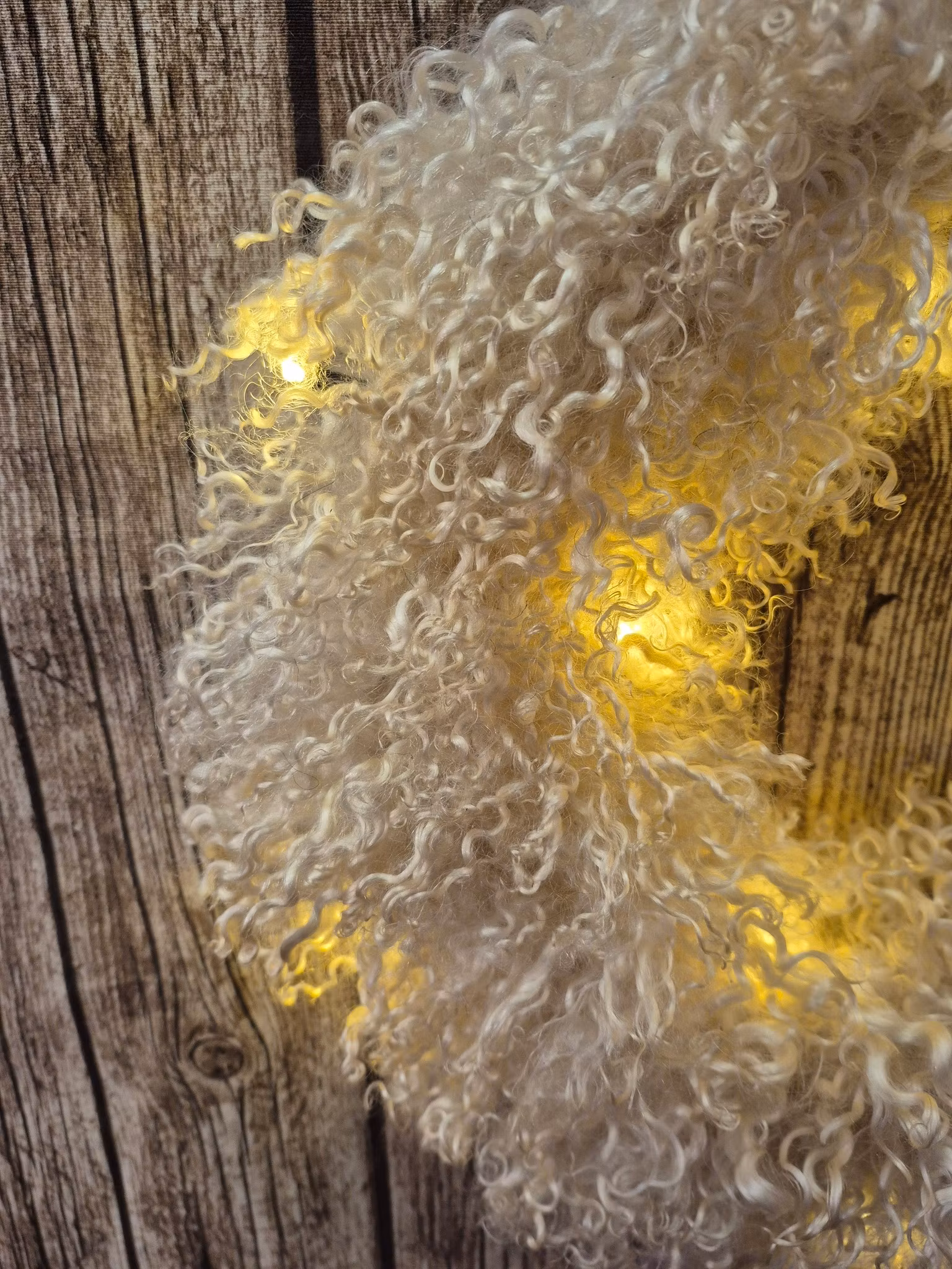 En elegant ullkrans i naturligt ljus fårull. Lockarna är långa och levande, med mjuka skiftningar i vitt och champagne som glimrar vackert i belysningen. Den varma LED-belysningen lyfter fram både glansen och djupet i lockarna, vilket gör kransen till ett blickfång oavsett var den hängs.