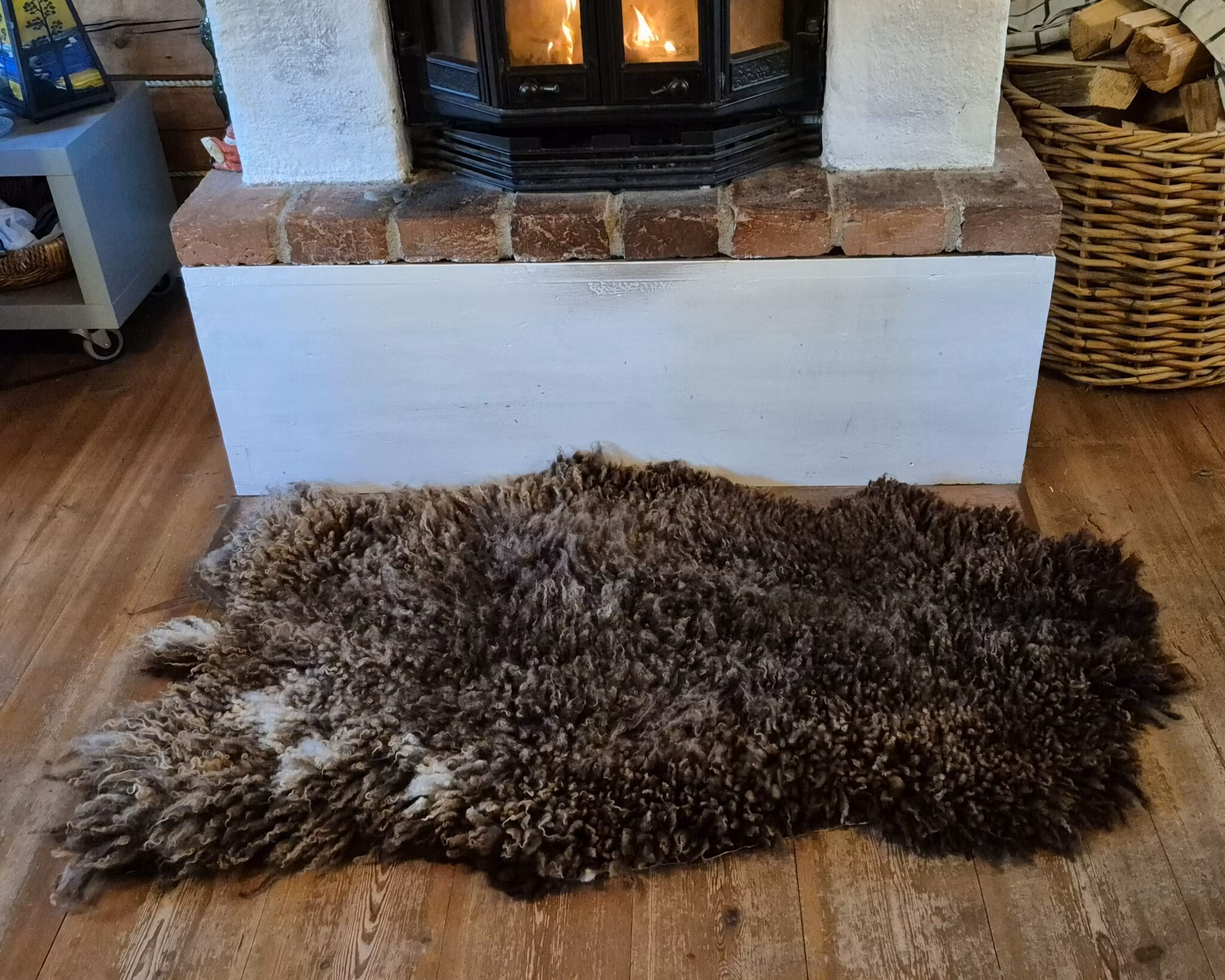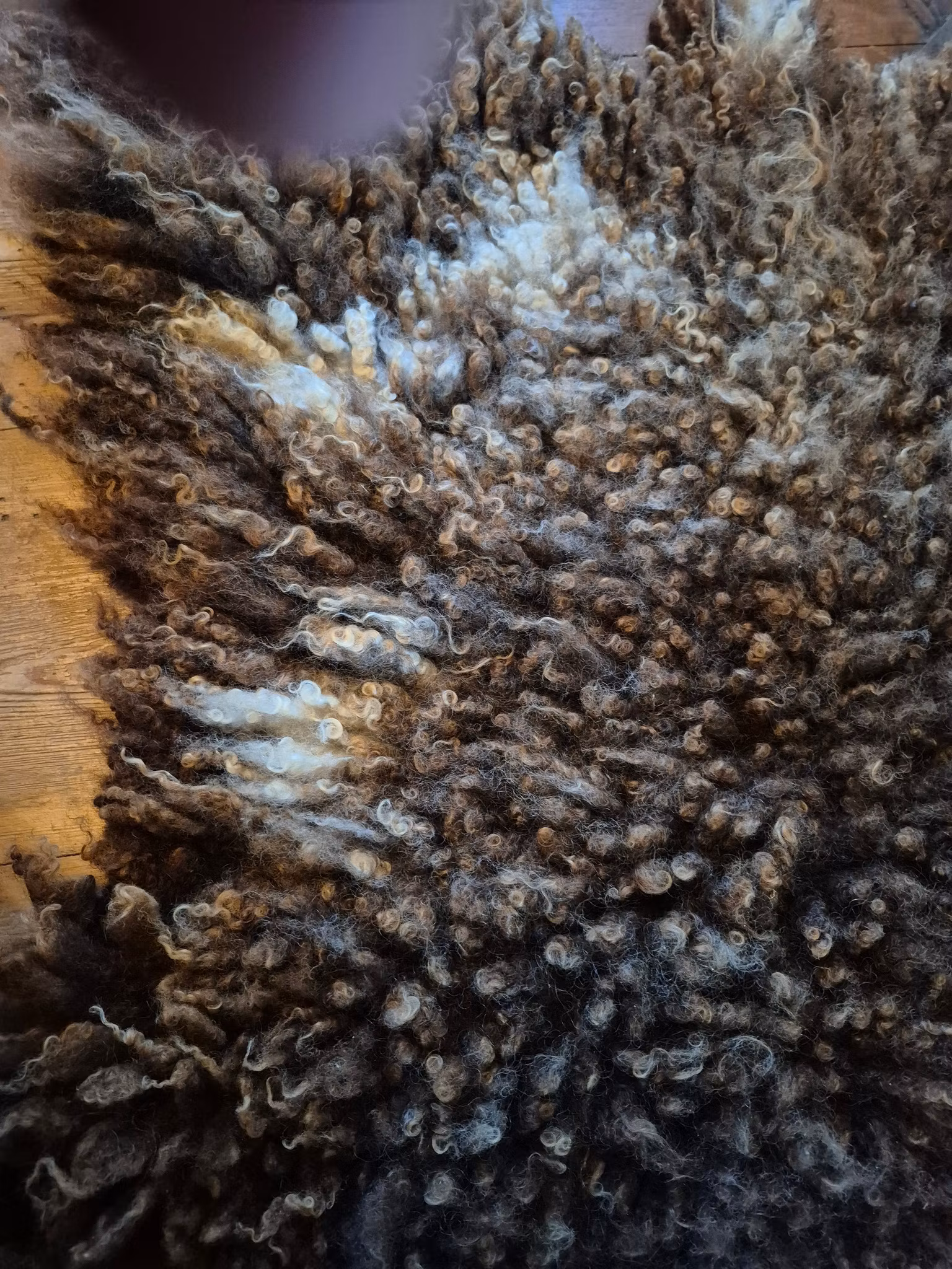 En rejäl och maffig fäll med djup, chokladbrun färg och vackra ljusa inslag som glittrar till mellan lockarna. Ullen är något kortare – ca 7 cm – men ändå tät, mjuk och spänstig med en naturlig glans. Det här är en fäll som verkligen gör plats för sig – perfekt att lägga i soffan, över sängen eller direkt på golvet framför kaminen.