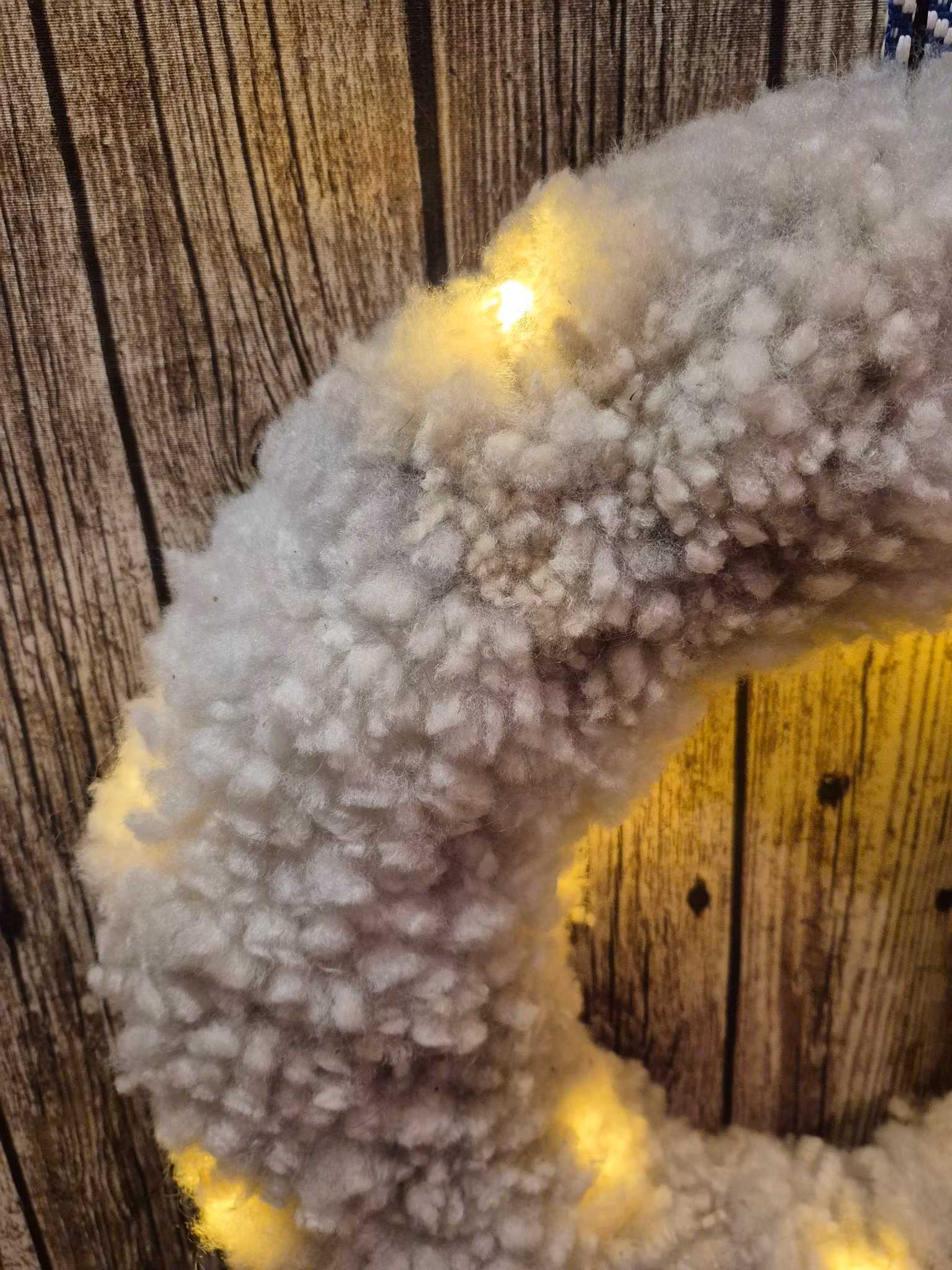 En stilren och mjuk ullkrans i naturligt gråtonad fårull. Den täta ullen ger en varm och mjuk känsla, och den grå botten skapar ett vackert djup som förstärks av den varma LED-belysningen. Kransen får en harmonisk och tidlös karaktär som passar lika bra i modern som i traditionell miljö.