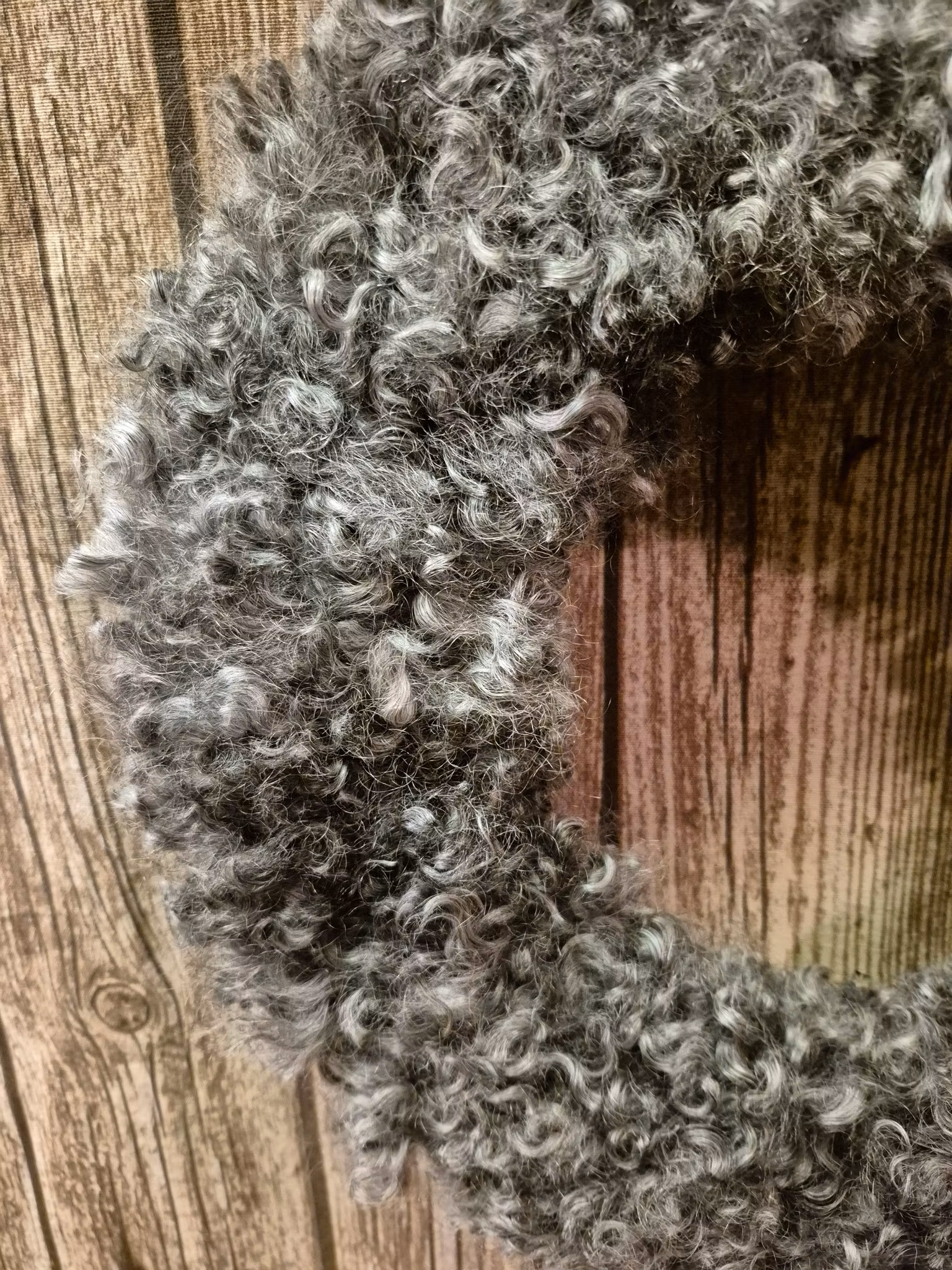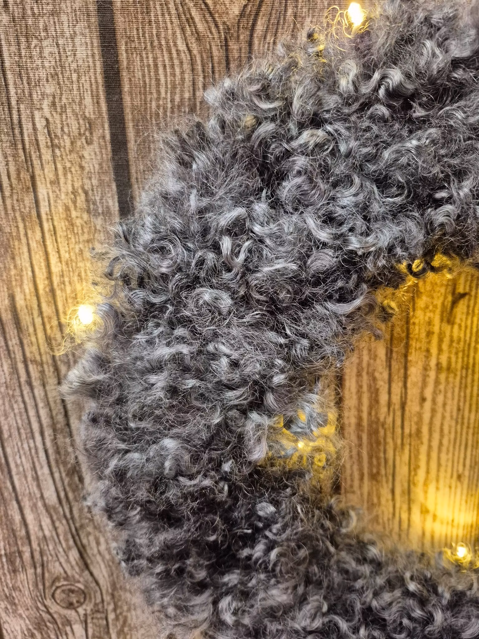 En nätt ullkrans i mörkgrå lockig fårull. De täta små lockarna skapar en vacker struktur, och den mörka tonen ger kransen en stilren och elegant känsla. Den varma LED-belysningen ger ett mjukt sken som framhäver gråtonernas djup och gör kransen stämningsfull både dag och kväll.