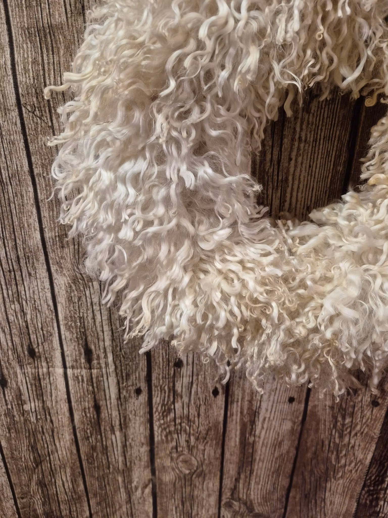 En nättare ullkrans i naturligt vit fårull, med mjuka små lockar som ger ett livfullt och charmigt uttryck. Kransen är tät och fyllig trots sin mindre storlek, vilket gör den lika vacker på en innerdörr som på en vägg. Den varma LED-belysningen förstärker den mjuka känslan och skapar en välkomnande stämning.