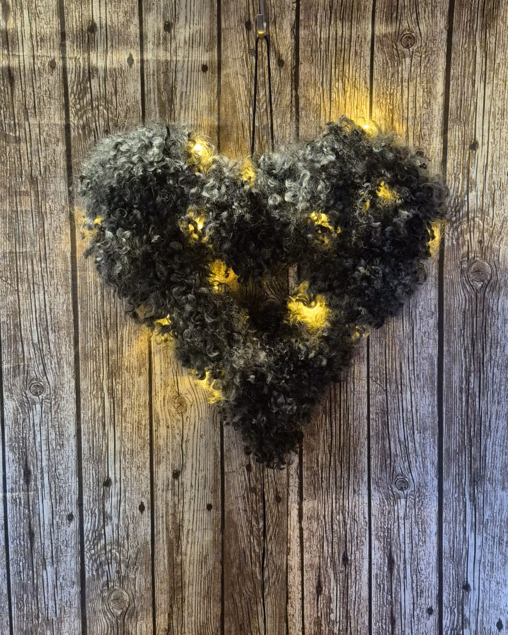 Hjärta med kraftiga lockar i blyertsgrått med belysning för dekoration på t.ex dörr, vägg eller i ett fönster. Ledslingan är för både inom- och utomhusbruk och har upp till 15 000 timmars brinntid. 10 m anslutningssladd.