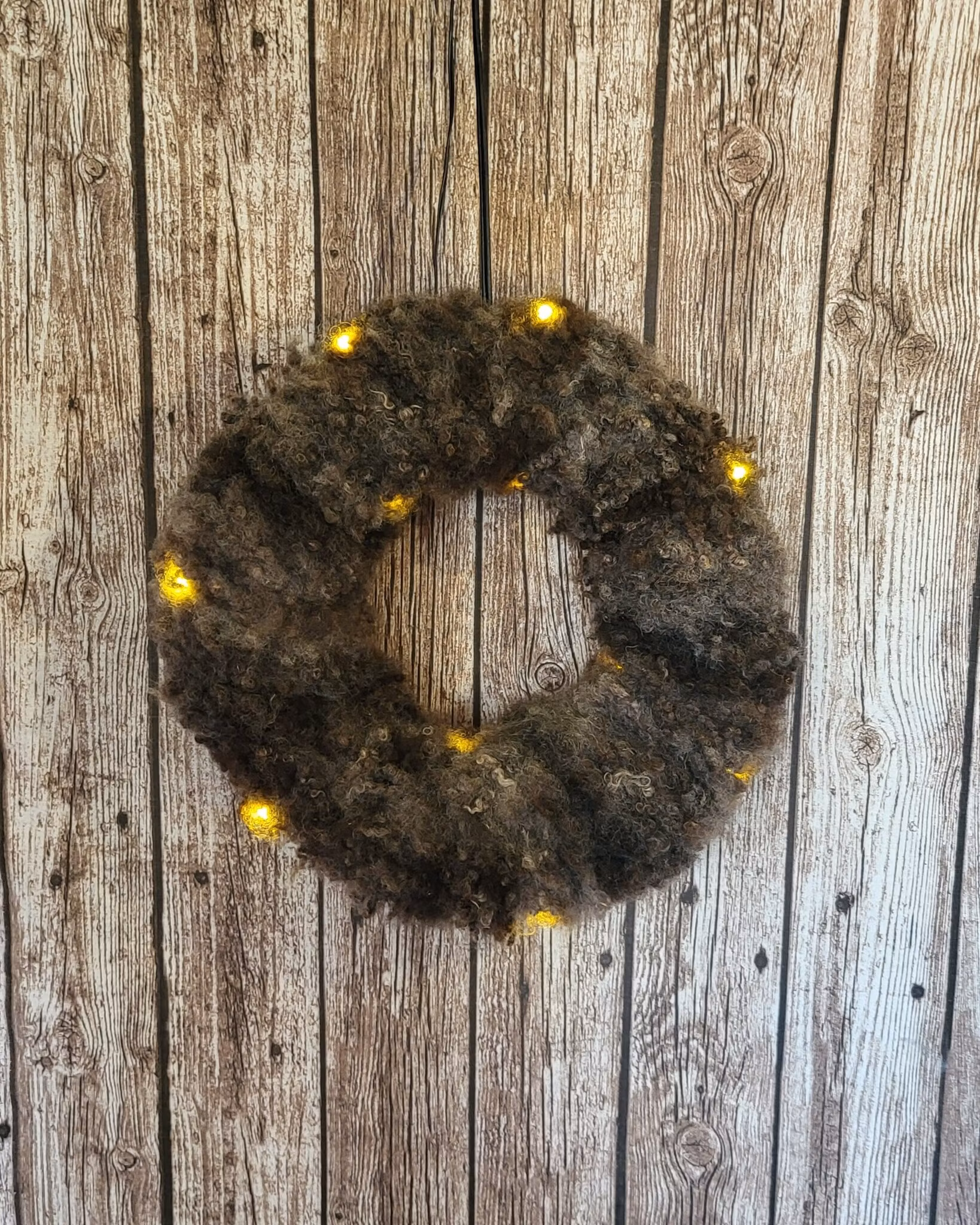 En jordnära och rustik krans i brun fårull, med inbyggd LED-belysning som ger ett varmt sken. De naturliga färgskiftningarna i ullen gör att varje krans får sin egen karaktär. Handgjord av skinn med ull och byggd på trästomme – för extra hållbarhet och formstabilitet.