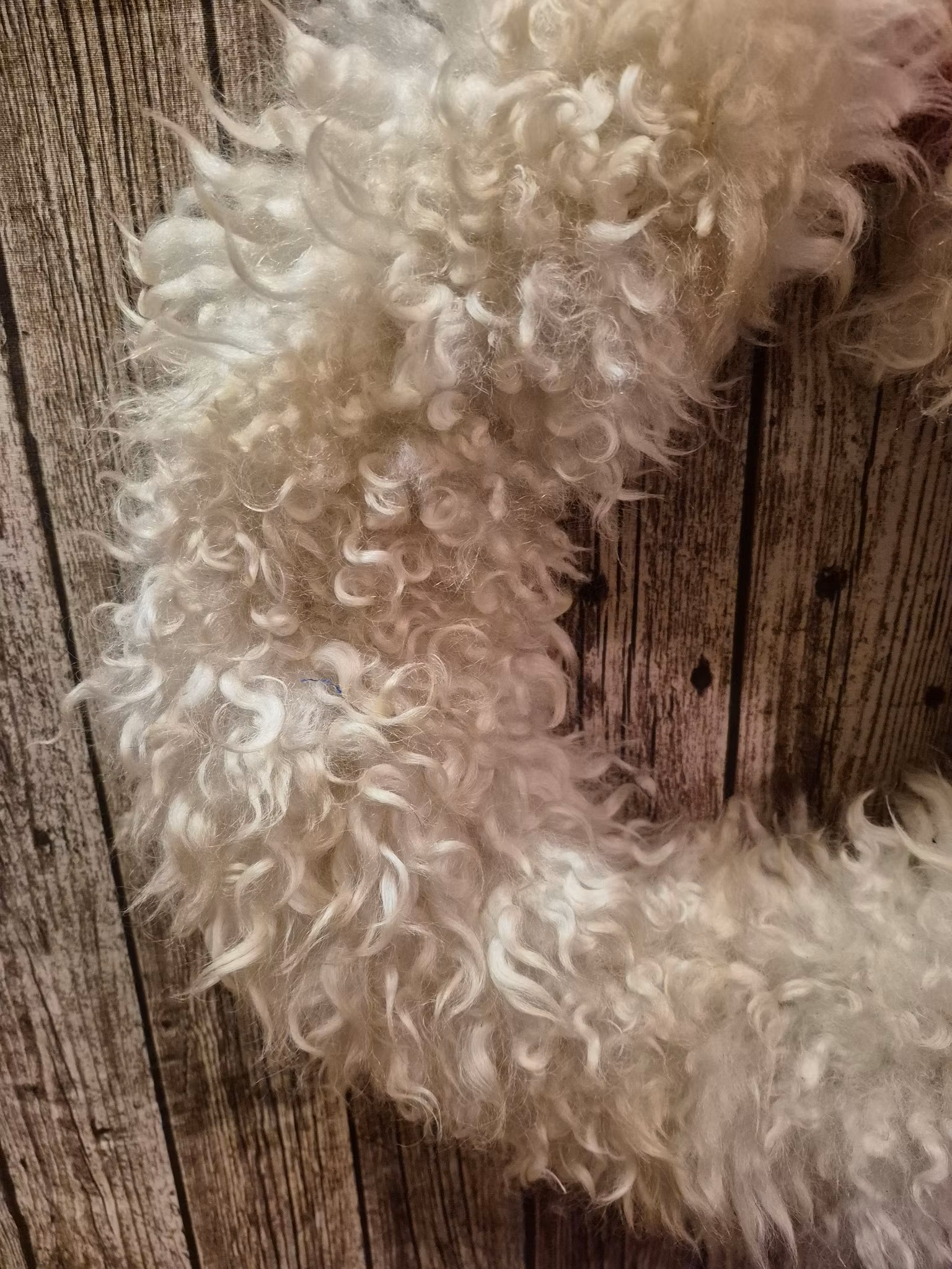 En mjuk och skimrande ullkrans i naturligt vit lockig fårull. Lockarna är långa och glansiga, och flera toppar har vackra inslag av silver och svarta stråk. Det skapar en livfull kontrast och gör kransen unik i sitt uttryck. Den varma LED-belysningen förstärker både glansen och djupet i färgerna, och ger ett varmt och stämningsfullt sken.