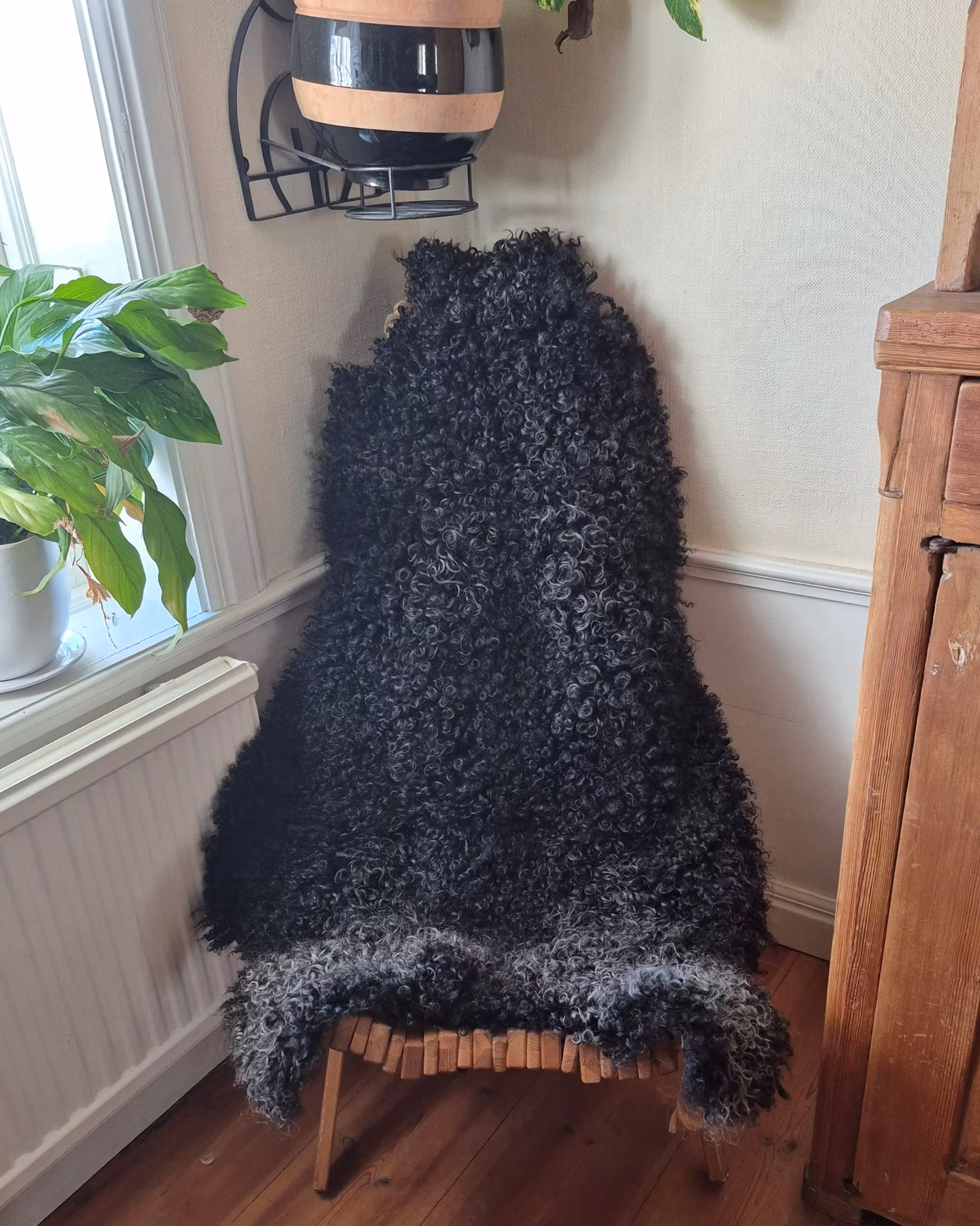 Fårfäll från Hälsingland med vackraa lockar. Fällen går från helt svart i nacken över till antracitgrå vid bakbenen.