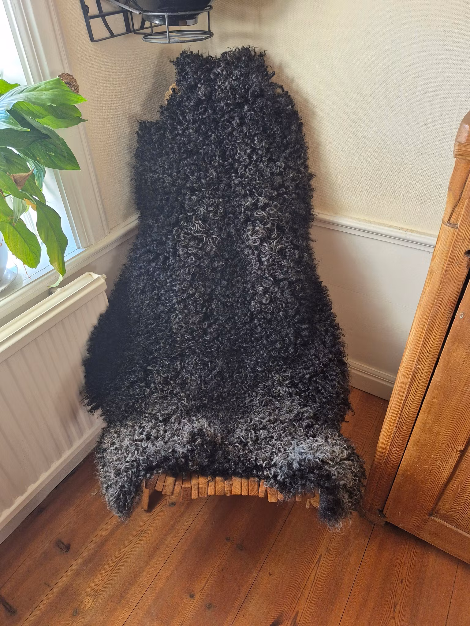 Stort grå/svart fårskinn med täta lockar.